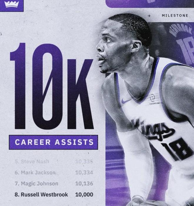 11月15日,威斯布鲁克在国王对阵森林狼的比赛中,全场得到13分10篮板13助攻的全面数据。此役过后,威少生涯助攻数也突破了一万次,排在历史第八名,在他身前的是“魔术师”约翰逊。